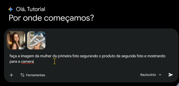 Você envia a imagem da influencer e a imagem do produto real (por exemplo, um tênis) e escreve um comando como: