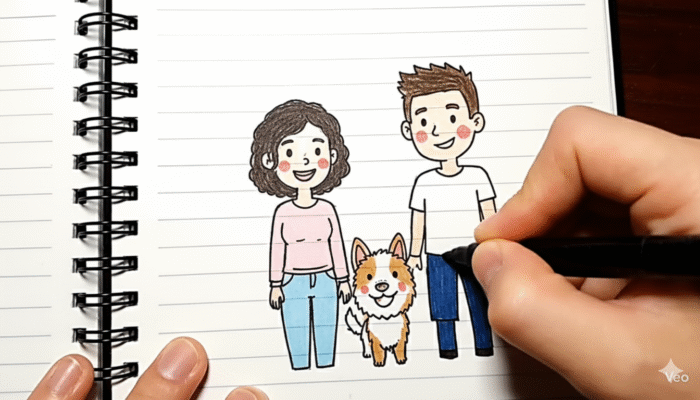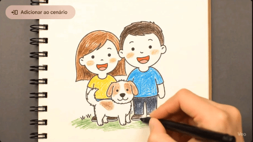 Faça um vídeo estilo mão desenhando em um “CADERNO“. Preciso que o desenho seja feito do zero, faça as linhas, contornos e cores. Faça a seguinte ilustração dentro: “UM CASAL FELIZ COM SEU CACHORRO“.