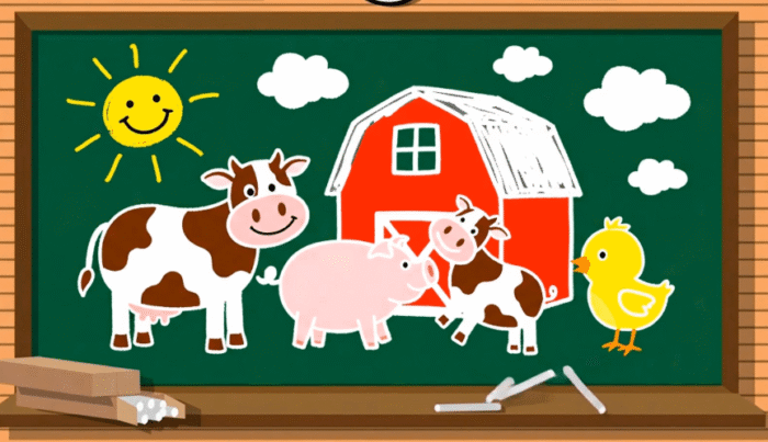 Faça um vídeo estilo mão desenhando dentro da imagem de referencia. Preciso que o desenho seja feito do zero, faça as linhas, contornos e cores. Estilo “GIZ BRANCO“. Faça a seguinte ilustração dentro: “ANIMAIS BRINCANDO EM UMA FAZENDA“.