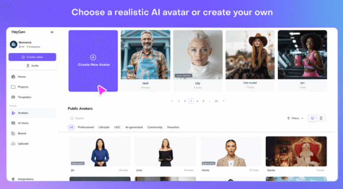 O HeyGen disponibiliza uma biblioteca com diversos avatares digitais que imitam pessoas reais, com movimentos de corpo, expressões faciais e gestos humanizados. Esses avatares podem ser usados para narrar conteúdos de forma profissional, sem que o criador precise aparecer em frente às câmeras.