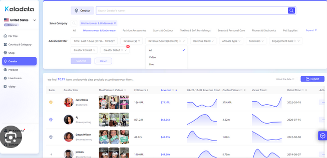 Depois de entrar na plataforma, você pode usar a barra de busca para pesquisar produtos, palavras-chave ou criadores. O Kalodata vai mostrar informações como número de vendas, tendência de crescimento e desempenho ao longo do tempo.