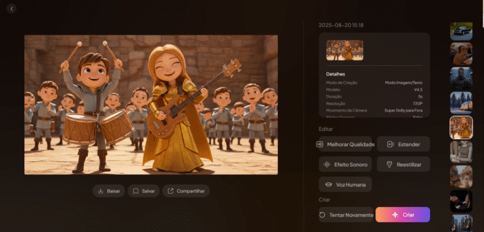 Após alguns minutos, seu vídeo é gerado e pode ser baixado diretamente ou compartilhado nas redes sociais.